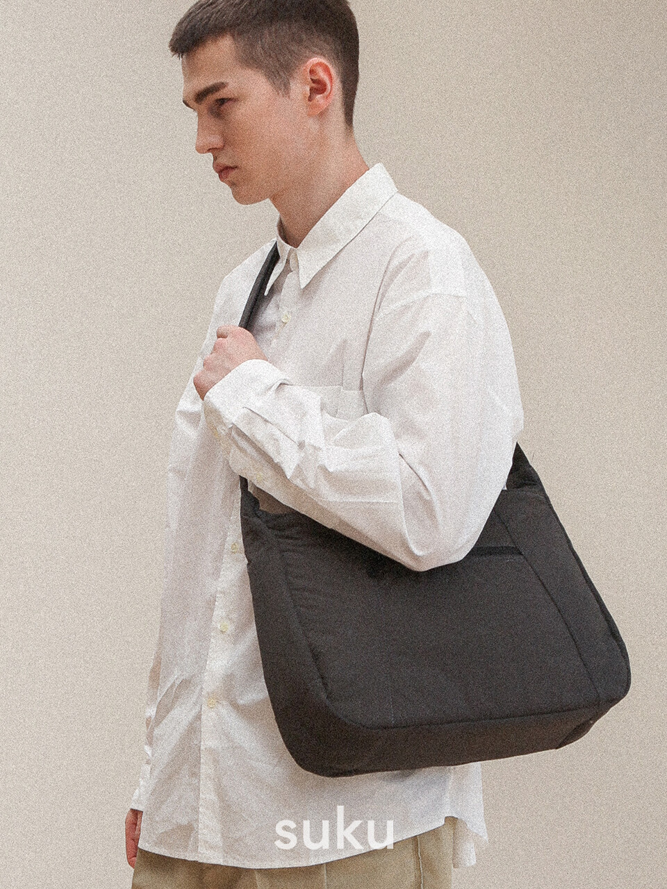 제품의 모서리에 곡선을 넣어 유려한 실루엣을 연출하였고, 전면의 절개사이에 포켓을 배치하였습니다. 물건을 수납해도 실루엣을 유지할 수 있도록 제품의 밑면에는 보강재를 추가했습니다. 숄더스트랩은 메인원단과 같은 원단을 공유하고 금속 부자재 또한 블랙 컬러에 무광 코팅을 진행하여 전체적인 통일감을 고려했습니다.