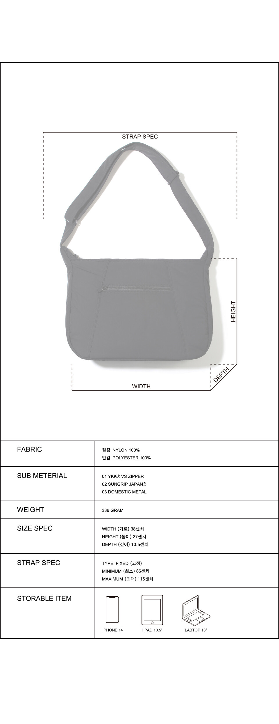 기본적인 생활 방수 기능을 지닌 나일론 원단을 채택하였으며, 솜을 후가공으로 본딩하여 푹신한 터치감을 가지며 수납한 제품을 보호할 수 있습니다.