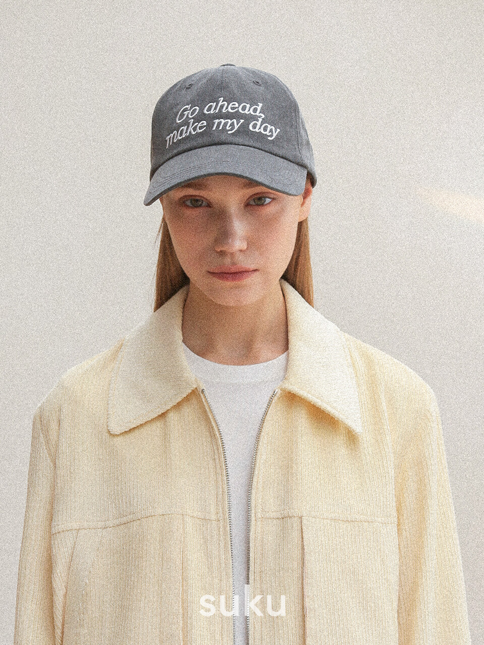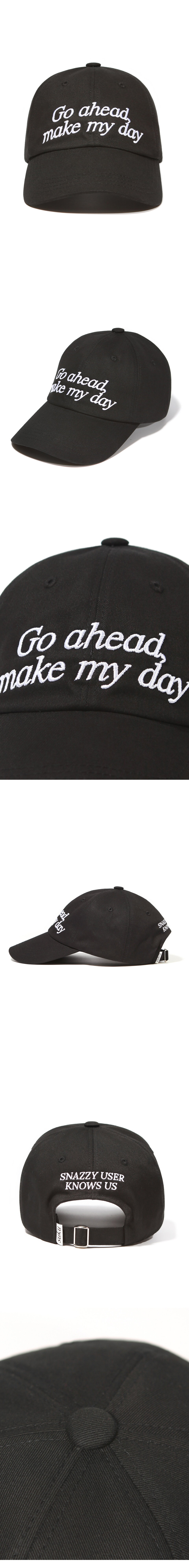 모자 전면에 영화 “더티 해리” 속 명대사 ‘Go ahead, Make my day’ 타이포를 배치했으며 후면에는 수쿠를 상징하는 타이포 ‘Snazzy user knows us’를 자수로 표현하여 디자인을 완성하였습니다.