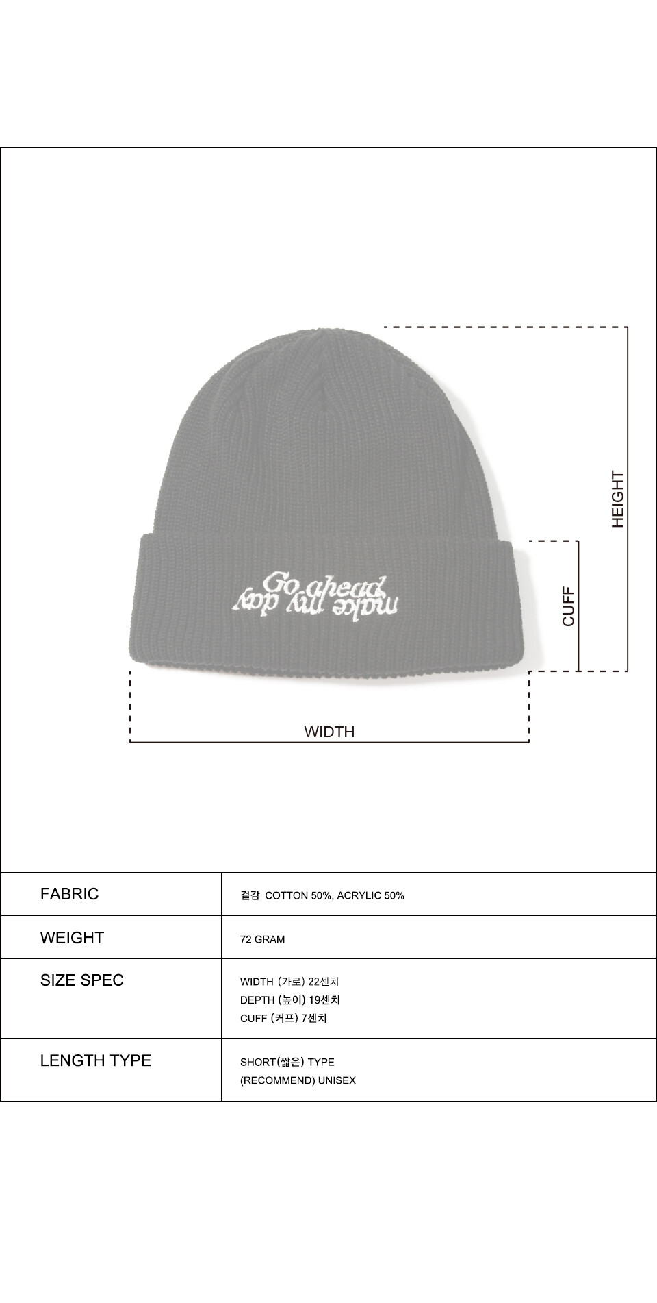 여러 번의 핏 수정을 거쳐 제작하여 시중의 숏 비니와는 다르게 푹 눌러쓰기 좋은 깊이감과 넉넉한 둘레감을 가져 얼굴형이 보완되는 핏으로 제작되었습니다.