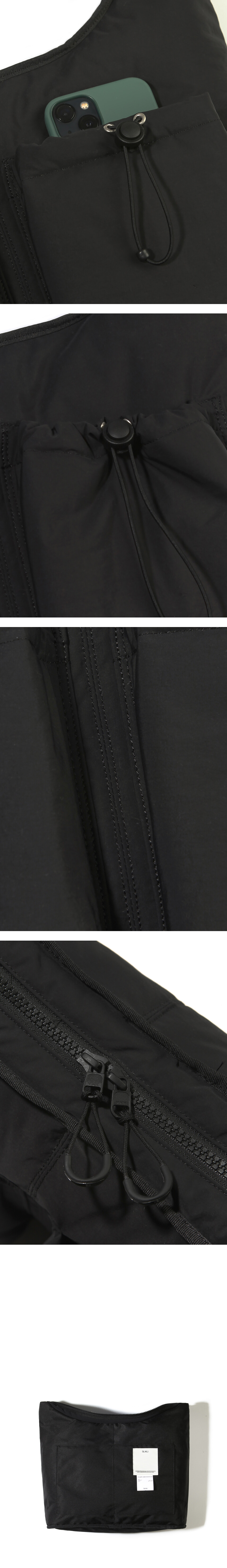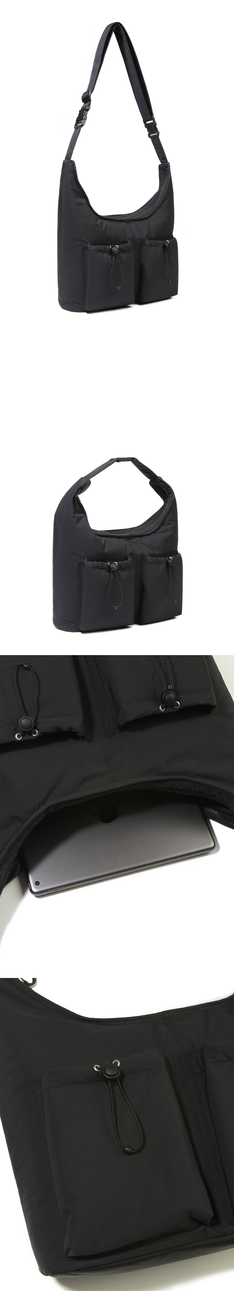원단은 기본적으로 생활 발수 및 방수 기능을 가진 나일론 원단에 2온즈의 솜을 본딩하여 사용하였습니다. 봉제선을 가방 중심에 두어 둥근 실루엣을 연출하였으며 숄더 스트랩 양쪽의 버클을 활용하여 크로스 백 및 숄더 백 등으로 다양한 활용이 가능합니다. 메인 수납공간 외에 외부 스트링 포켓과 내부 포켓을 활용하여 소지품 분리 수납에 용이합니다.