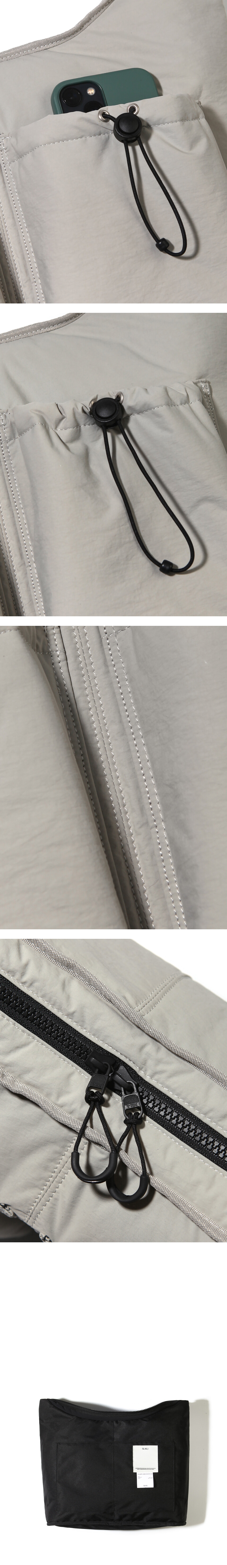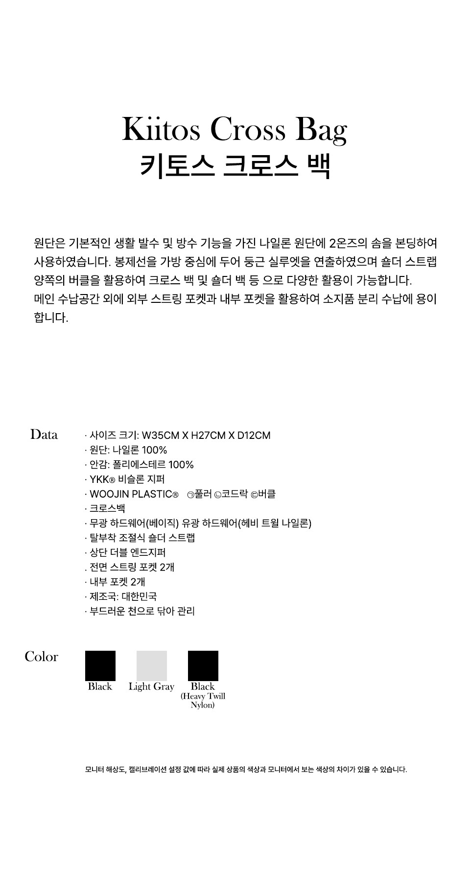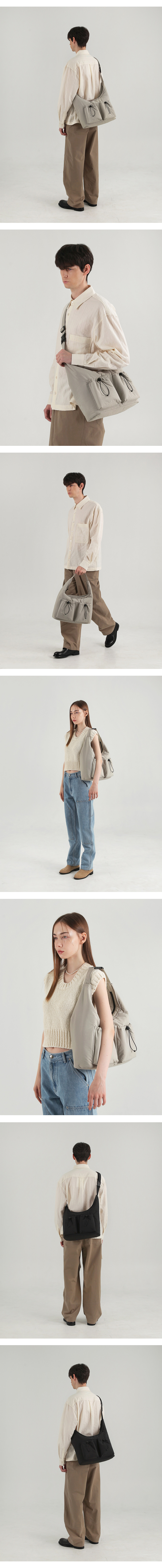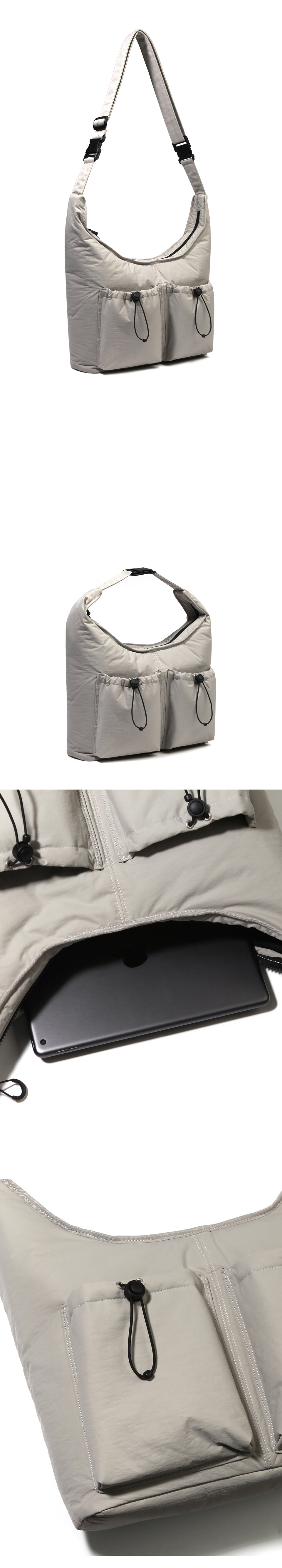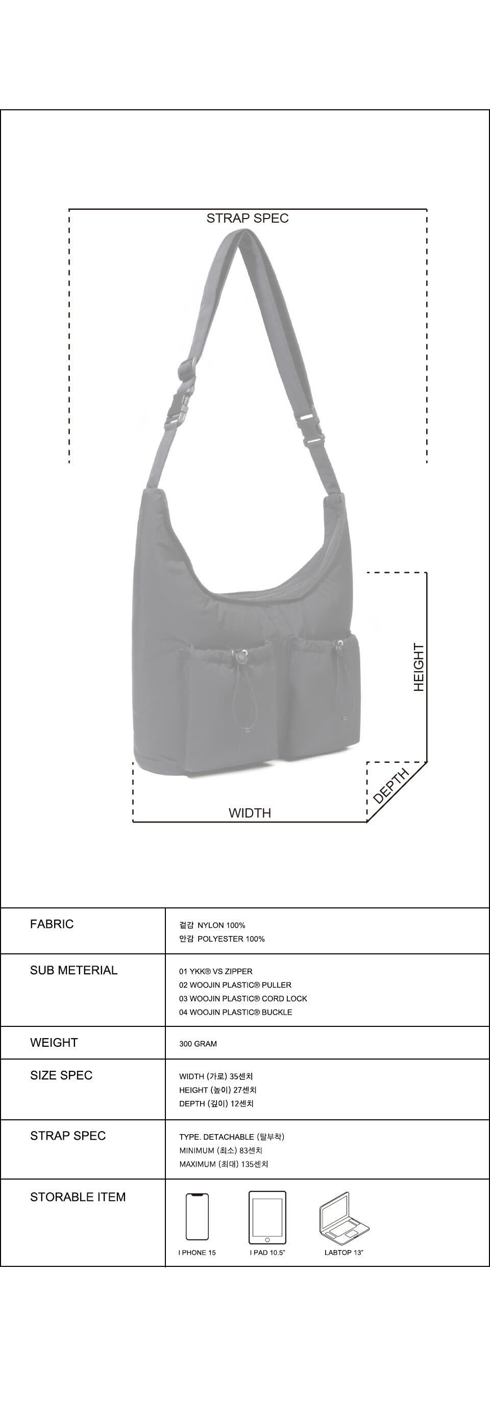 원단은 기본적으로 생활 발수 및 방수 기능을 가진 나일론 원단에 2온즈의 솜을 본딩하여 사용하였습니다. 봉제선을 가방 중심에 두어 둥근 실루엣을 연출하였으며 숄더 스트랩 양쪽의 버클을 활용하여 크로스 백 및 숄더 백 등으로 다양한 활용이 가능합니다. 메인 수납공간 외에 외부 스트링 포켓과 내부 포켓을 활용하여 소지품 분리 수납에 용이합니다.