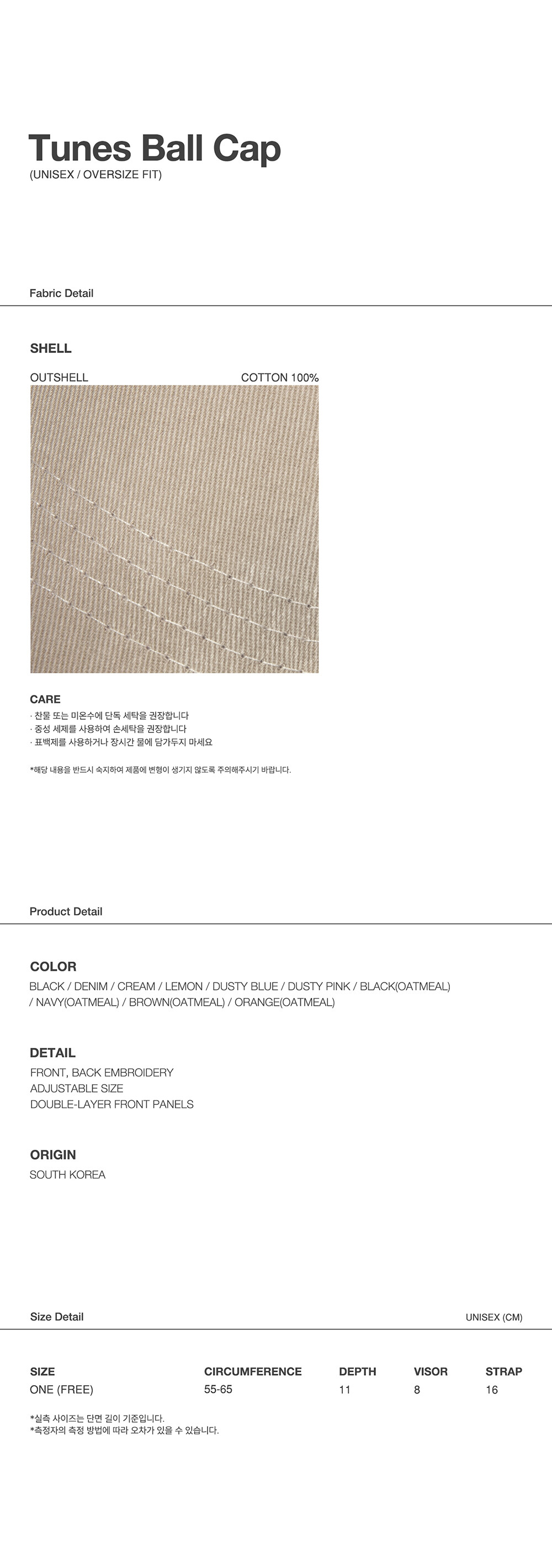 · 볼캡 · 커브바이저 · 6패널 · 조절식 스트랩(후면) · 프리 사이즈(유니섹스) · 제조국: 대한민국 · 변형을 고려하여 가급적 손세탁 권장
