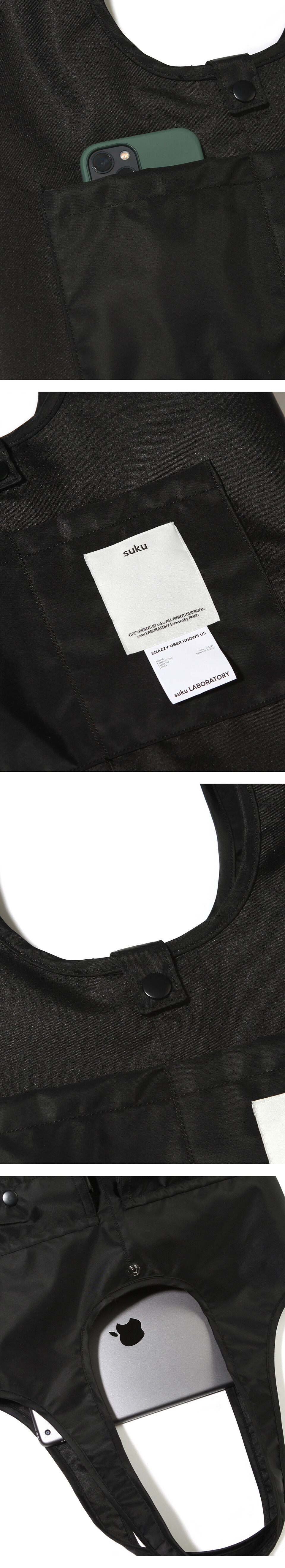 메인 수납공간 외에 외부의 스냅 포켓과 내부 포켓을 활용하여 소지품 분리 수납에 용이합니다.