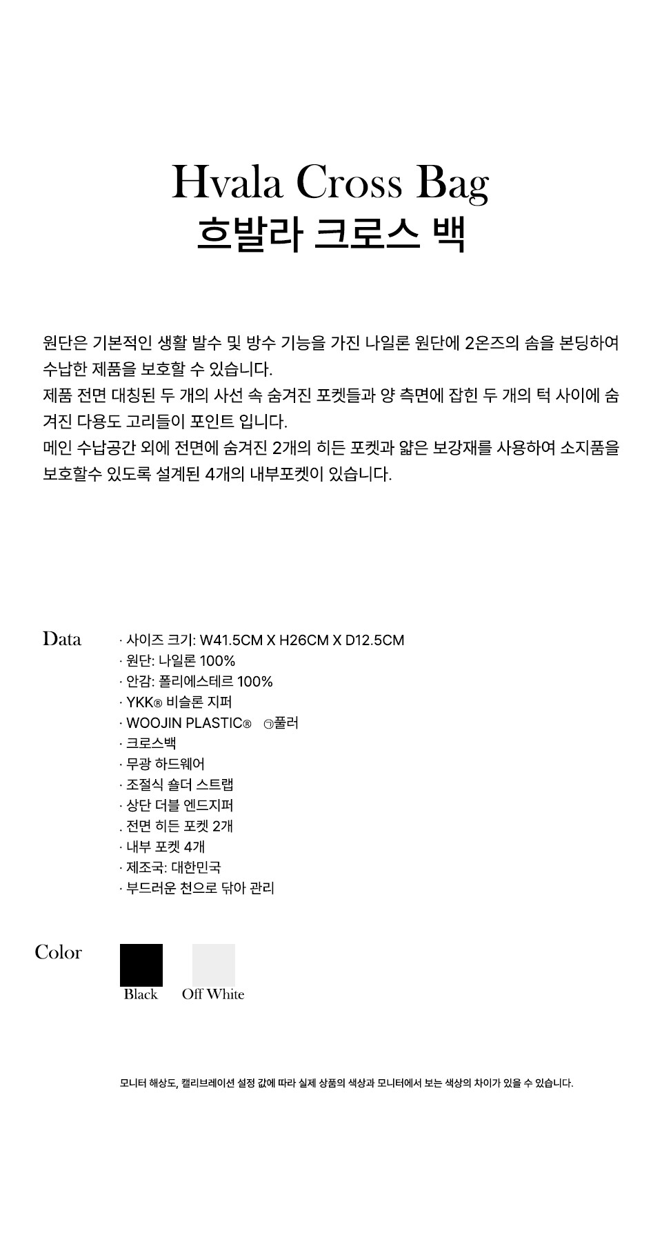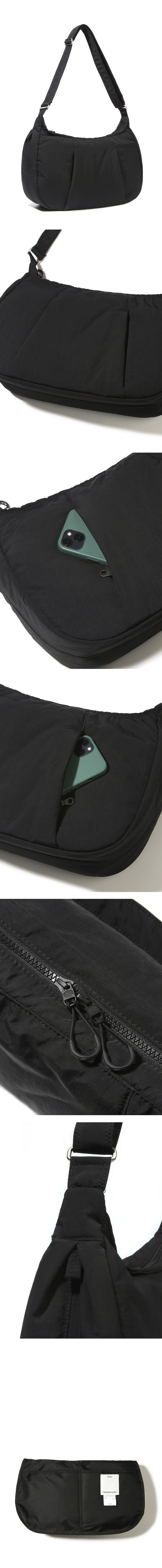 원단은 기본적인 생활 발수 및 방수 기능을 가진 나일론 원단에 2온즈의 솜을 본딩하여 수납한 제품을 보호할 수 있습니다. 제품 전면 대칭된 두 개의 사선 속 숨겨진 포켓들과 양 측면에 잡힌 두 개의 턱 사이에 숨겨진 다용도 고리들이 포인트입니다. 메인 수납공간 외에 전면에 숨겨진 2개의 히든 포켓과 얇은 보강재를 사용하여 소지품을 보호할 수 있도록 설계된 4개의 내부포켓이 있습니다.