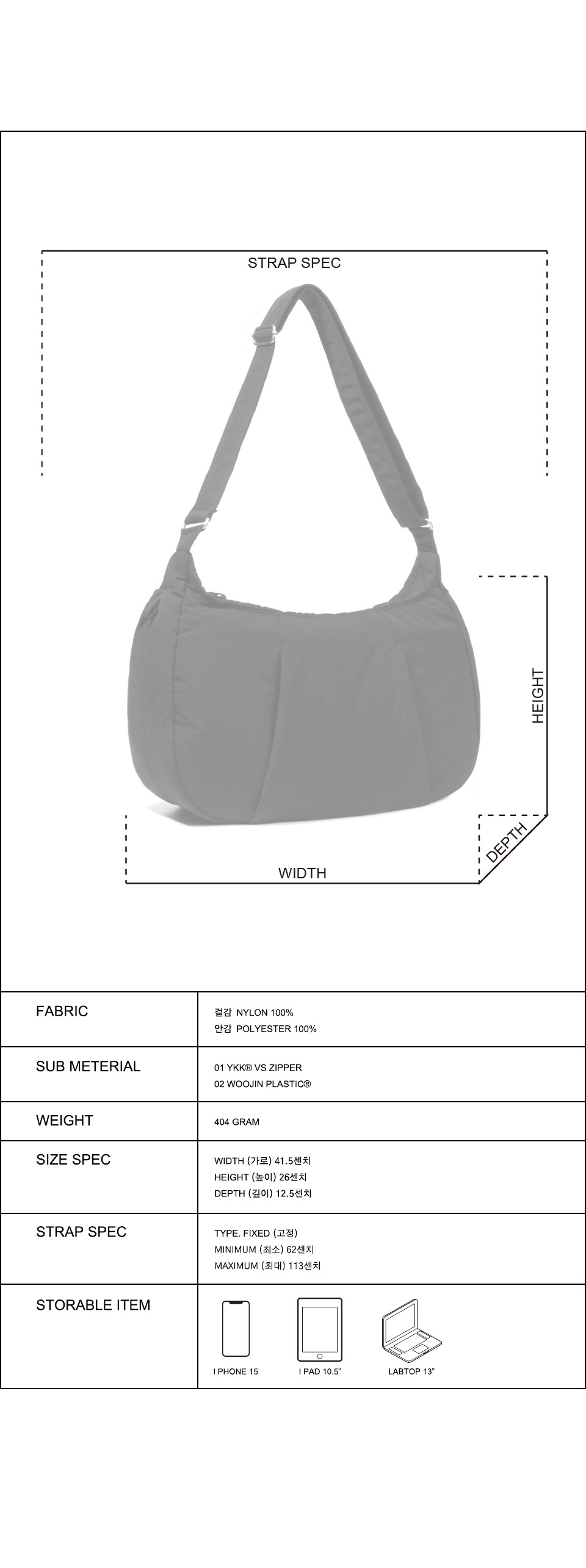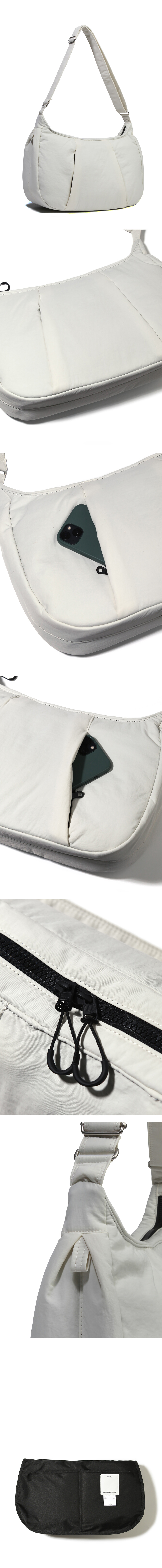 원단은 기본적인 생활 발수 및 방수 기능을 가진 나일론 원단에 2온즈의 솜을 본딩하여 수납한 제품을 보호할 수 있습니다. 제품 전면 대칭된 두 개의 사선 속 숨겨진 포켓들과 양 측면에 잡힌 두 개의 턱 사이에 숨겨진 다용도 고리들이 포인트입니다. 메인 수납공간 외에 전면에 숨겨진 2개의 히든 포켓과 얇은 보강재를 사용하여 소지품을 보호할 수 있도록 설계된 4개의 내부포켓이 있습니다.